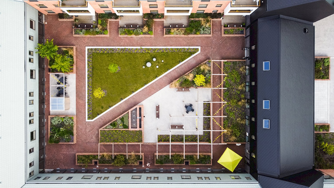 The courtyard is an active focal point for the scheme and features pergolas, a central lawn and raised planting beds