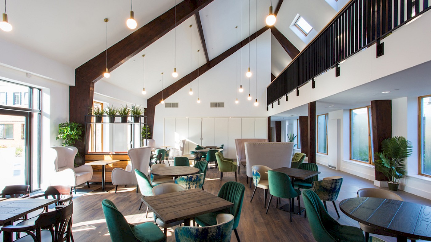 A striking black barn sits between the courtyards and provides a focus for communal living, containing offices, activity room, hair and beauty salon, laundry, lounge/games room and medical treatment rooms. This centralised provision contributes hugely to social life at the development, especially the bistro, which can cater for internal events as well as act as a function space for local people.