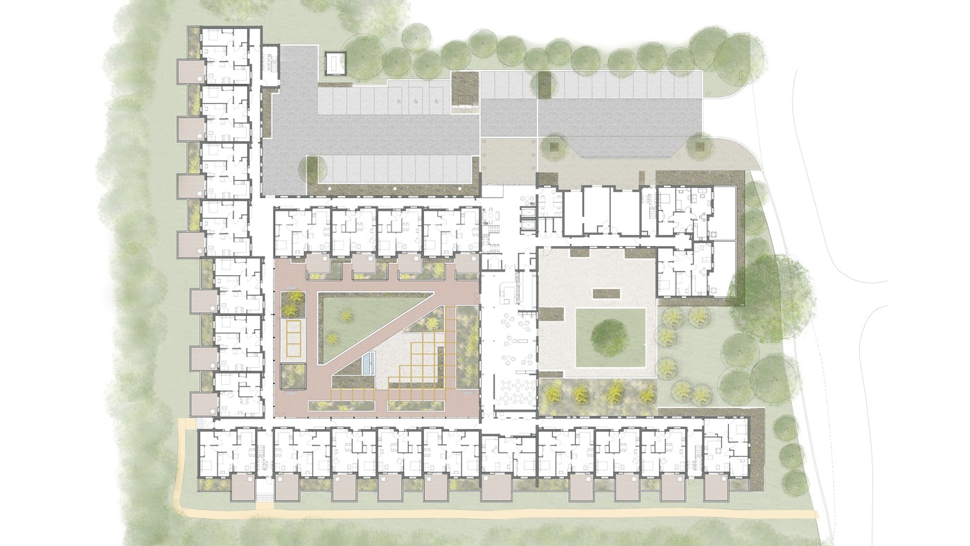 60 apartments, split into 40 two-bed and 20 one-bed homes, are arranged around two landscaped courtyards and set within existing mature trees, affording all residents a strong connection to nature. The external space serves multiple purposes as a place to gather, exercise and relax by including gym equipment, a variety of seating options, raised planting beds and a gently rippling water feature.