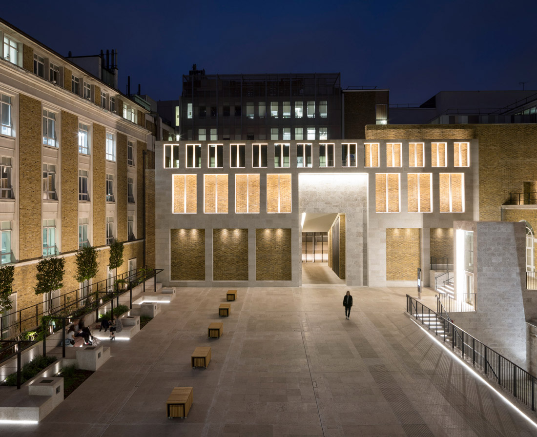 The terrace is sculpturally carved out of Portland stone, a sustainable and durable material that also makes up UCL’s Grade I listed Wilkins Building. A new ‘fourth façade’ completes the composition, working in harmony with the surrounding buildings. Designed to classical proportions, this also conceals the myriad services required for the wider campus and new Lower Refectory.