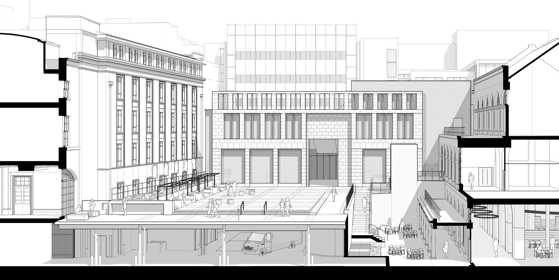 Sectional perspective showing new terrace above existing service yard and relationship to surrounding buildings