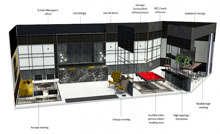 This section illustrates part of our vision for residents’ facilities and concierge within the second phase of the Aberfeldy Estate. This space will also include a gym, meeting room and small cinema.