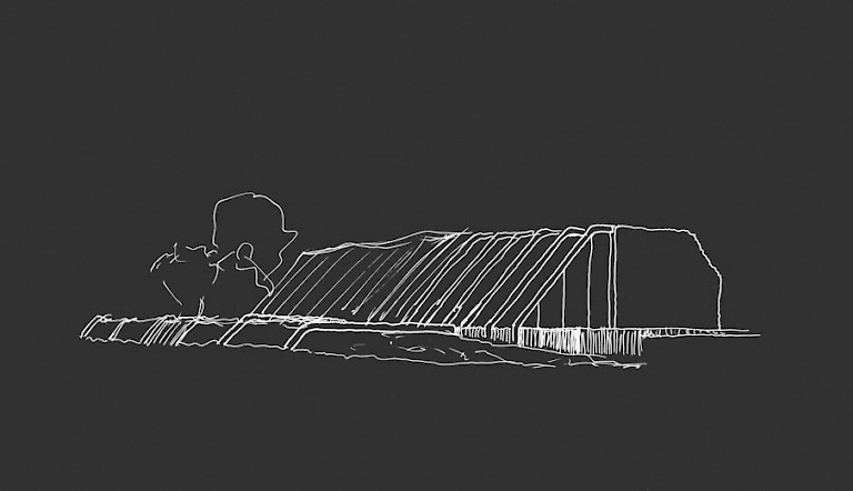 This is a concept sketch of our competition proposal for the new science centre building at the Royal Hosiptal School in Suffolk. Knitted into the landscape of the 20th century listed estate, the activity within is visible through the permeable central atria core and an external pathway leads pedestrians over the subterranean section of the building.