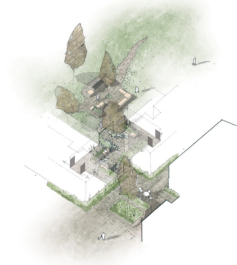 This competition submission, for a mixed residential development in Gloucestershire, explored themes of privacy, communality and incidental encounters.