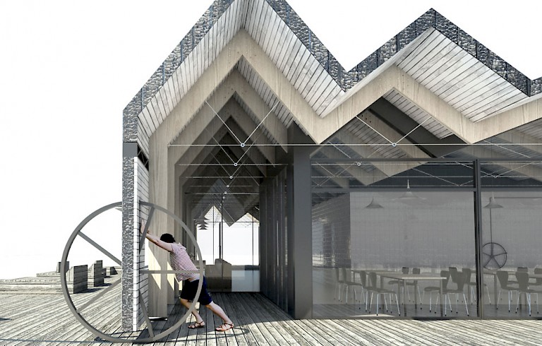 This image illustrates the flexible layout of the Wish Tower restaurant we are currently working on in Eastbourne. Inspired by the nautical context and iconic building it replaces, it can be reconfigured to respond to the weather, with wind breakers and covers to protect diners from the elements.